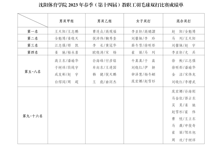 本次比赛设男子双打(甲组)、男子双打(乙组)、女子双打、混合双打四个项目。比赛中,教职工们在挥洒汗水中体验着合作与竞争,在切磋球技同时增进情谊,充分展示了羽毛球运动的魅力,赛出了沈体教工的运动风采。经过激烈角逐,最终产生男子双打(甲组)前八名,男子双打(乙组)前八名,女子双打前八名,混合双打前十六名。